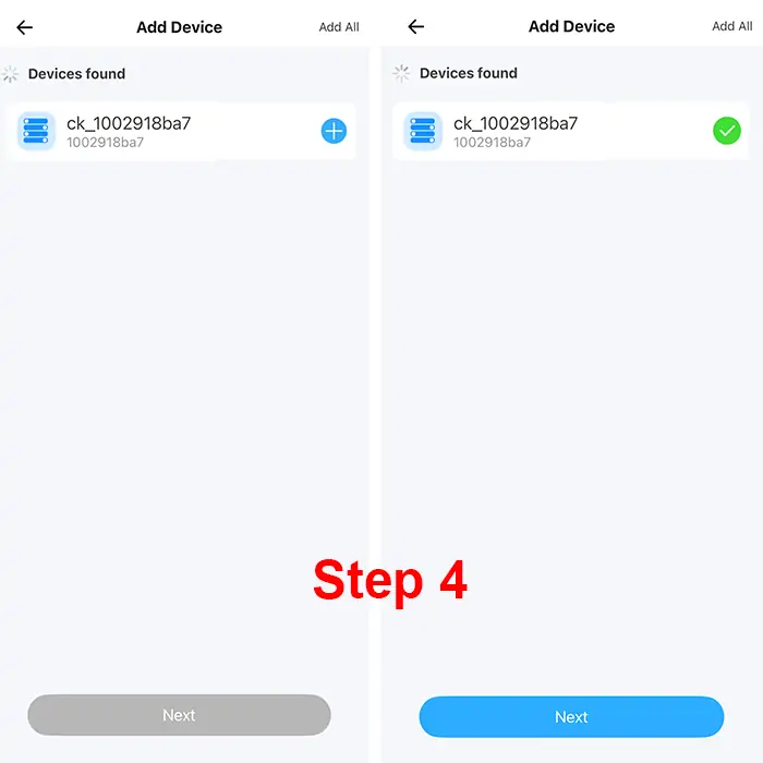 Open Ewelink APP. Tap "+" to add a device in top right corner of screen, and enter password of connected 2.4G WIFI.