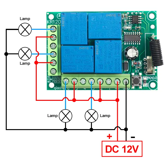 - Press the remote control button (such as A), and the corresponding relay on the receiver will turn on.