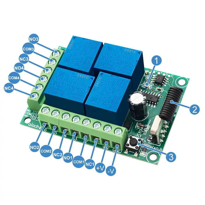 - Press and hold the remote control button corresponding to relay channel 1 (such as A), and relay channel 1 on the receiver will turn on; release button A, and relay channel 1 will turn off.