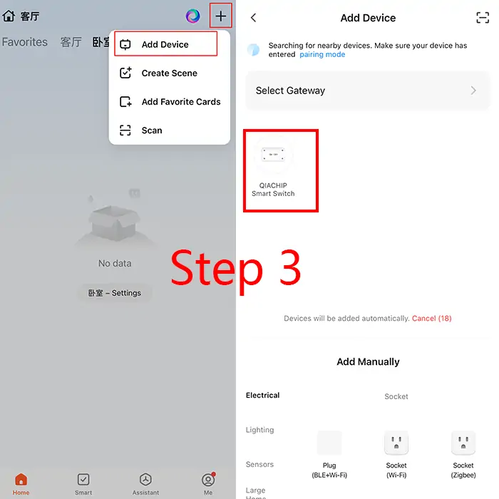 Open the Tuya APP. Tap "+" to add a device in the top right corner of the screen, and then tap the device that appears to start the pairing process.