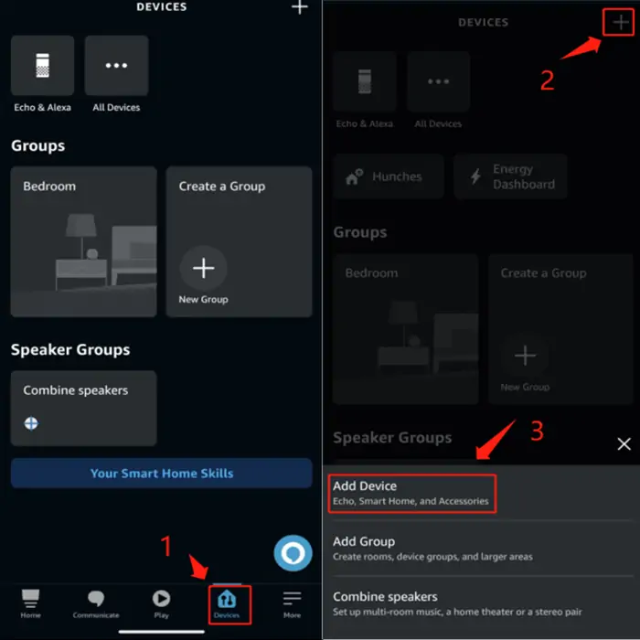 Open the Alexa app, select Devices, tap "+" in the top right corner, then choose Add Device.