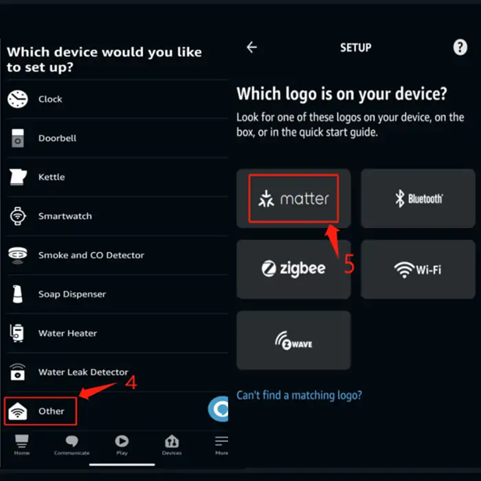 Select Other Device, then select Matter, scan the QR code on the product, and follow the prompts to complete pairing.