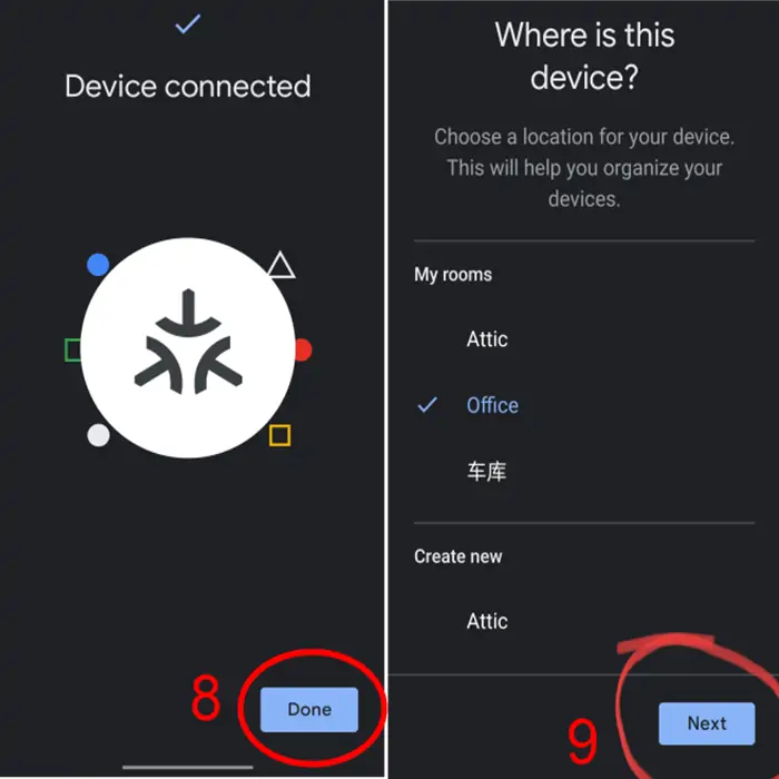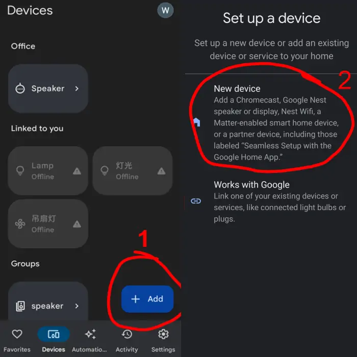 Open the Google Home app, tap + Add, then select New device to add a device.