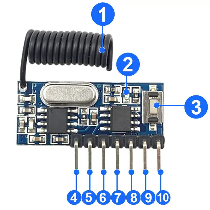 - Press the corresponding button on the remote control once, and the corresponding pin on the receiver module will continuously output a high-level signal "1".